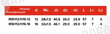 | MSH12/H16-12 | 12 | 28x1.5 | 40.6 | 26.0 | 24.9 | 57 | 7 | 4 |
